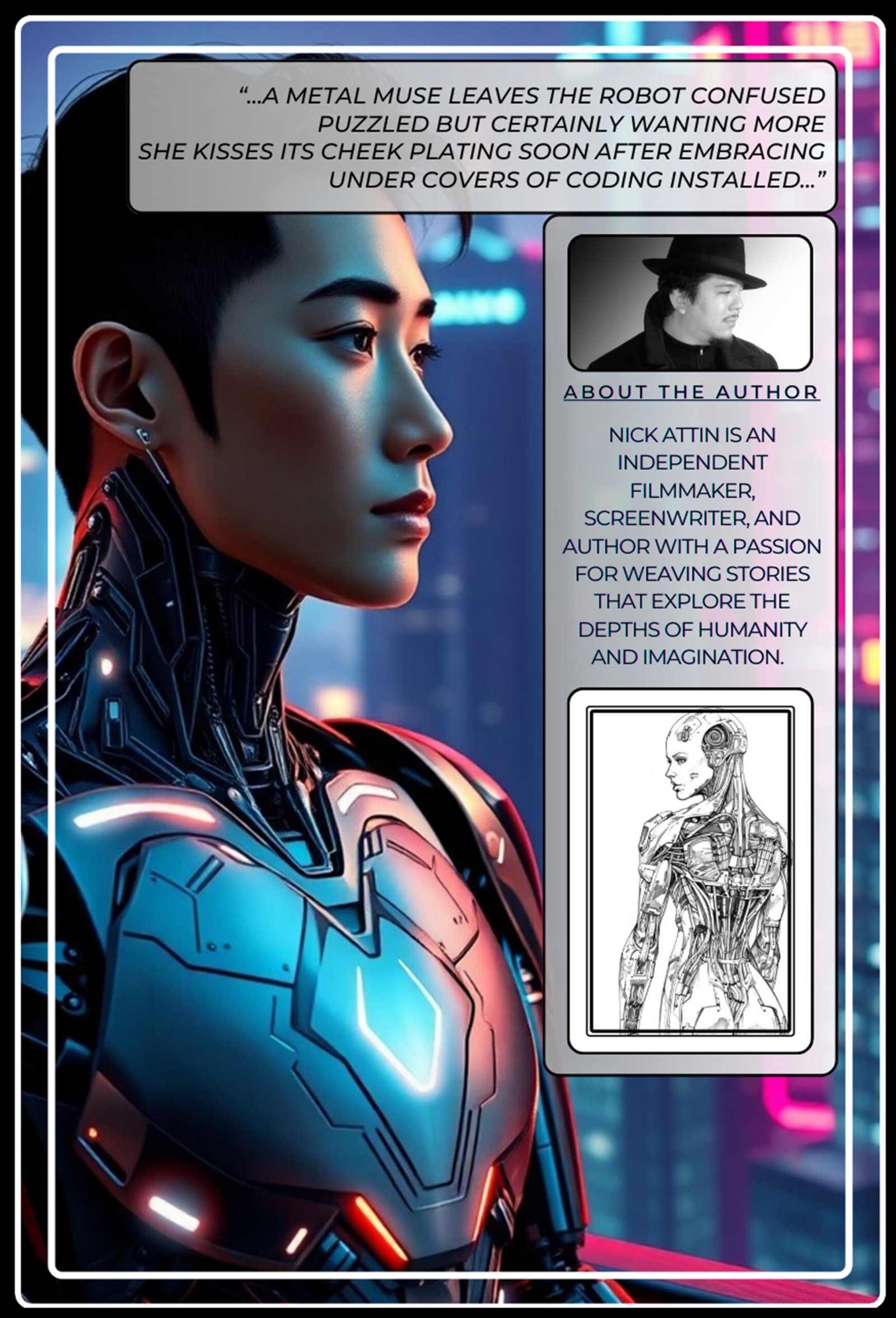 Each poem is a window into their sentient awakening, as they navigate a futuristic cityscape teeming with innovation yet yearning for soul. Their paths, though uniquely challenging, converge in the tranquil forest village of Kay—a place where the boundaries between machine and human blur, culminating in their metamorphosis into the next generation of humanity.